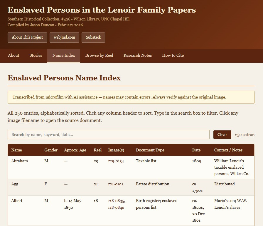 I worked with AI Claude Code for many hours feeding it document images and asking it to create research guides and name indexes — both the names of slaves and of everyone else mentioned in these documents. While the transcriptions aren’t perfect, the research guides will help me search for information that I can use in other projects about local history from the late 1700s and early 1800s.